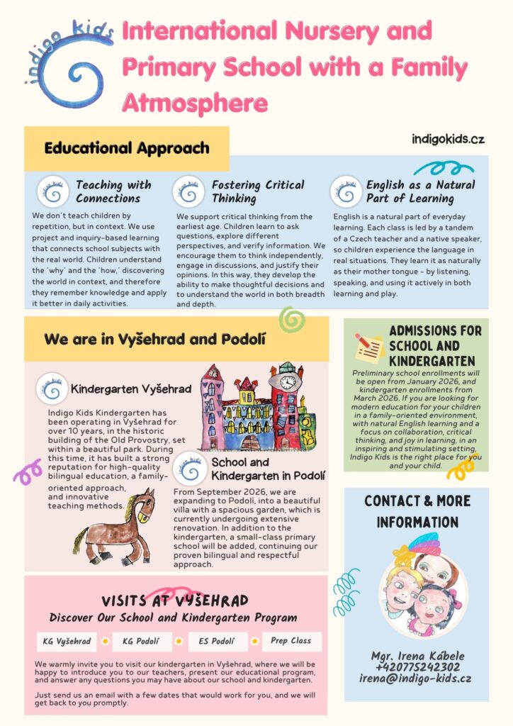 Indigo Kids Elementary School builds its curriculum on the foundation of the new Czech Framework Educational Program (FEP), which emphasizes the development of key competences, cross-curricular connections, and active student engagement in the learning process.
