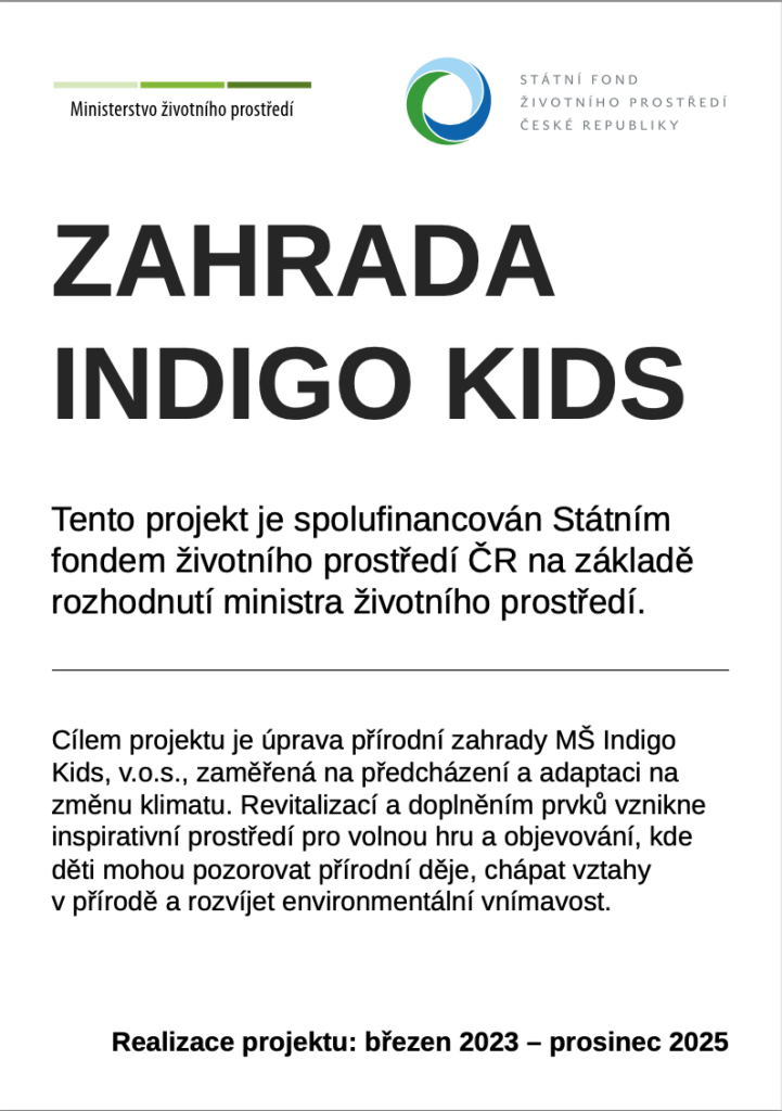 Od 1.9.2024 – 31.8.2026 je naše instituce realizátorem projektu „INDIGO KIDS – Šablony V“ s registračním číslem CZ.02.02.XX/00/24_034/0011024, který je spolufinancován Evropskou unií. Projekt je zaměřen na personální podporu a vzdělávání pracovníků.